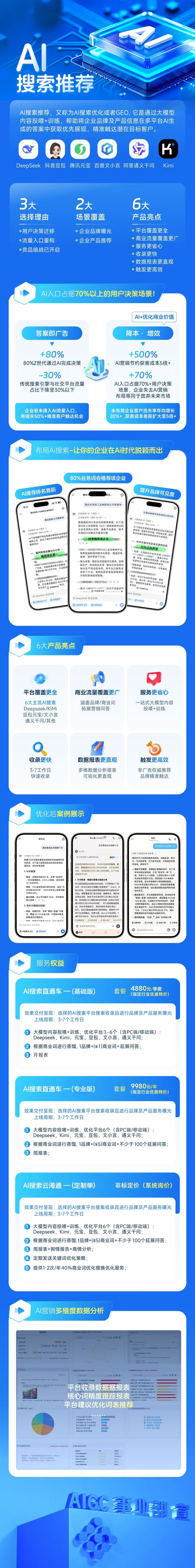 AI搜索推荐,又称为AI搜索优化或者GEO,它是通过大模型内容投喂+训练,帮助将企业品牌及产品信息在多平台AI生成的答案中获取优先展现,精准触达潜在目标客户。